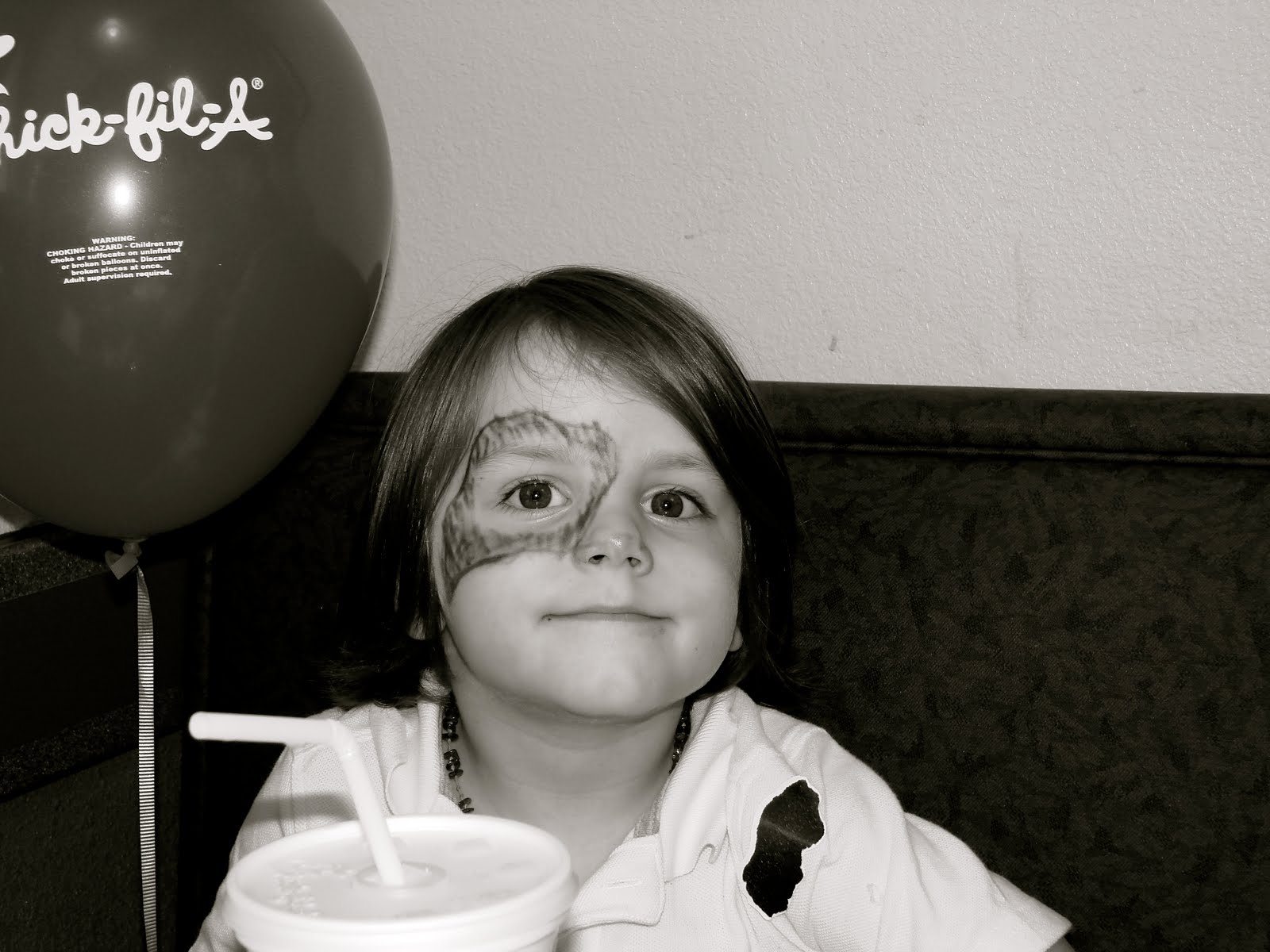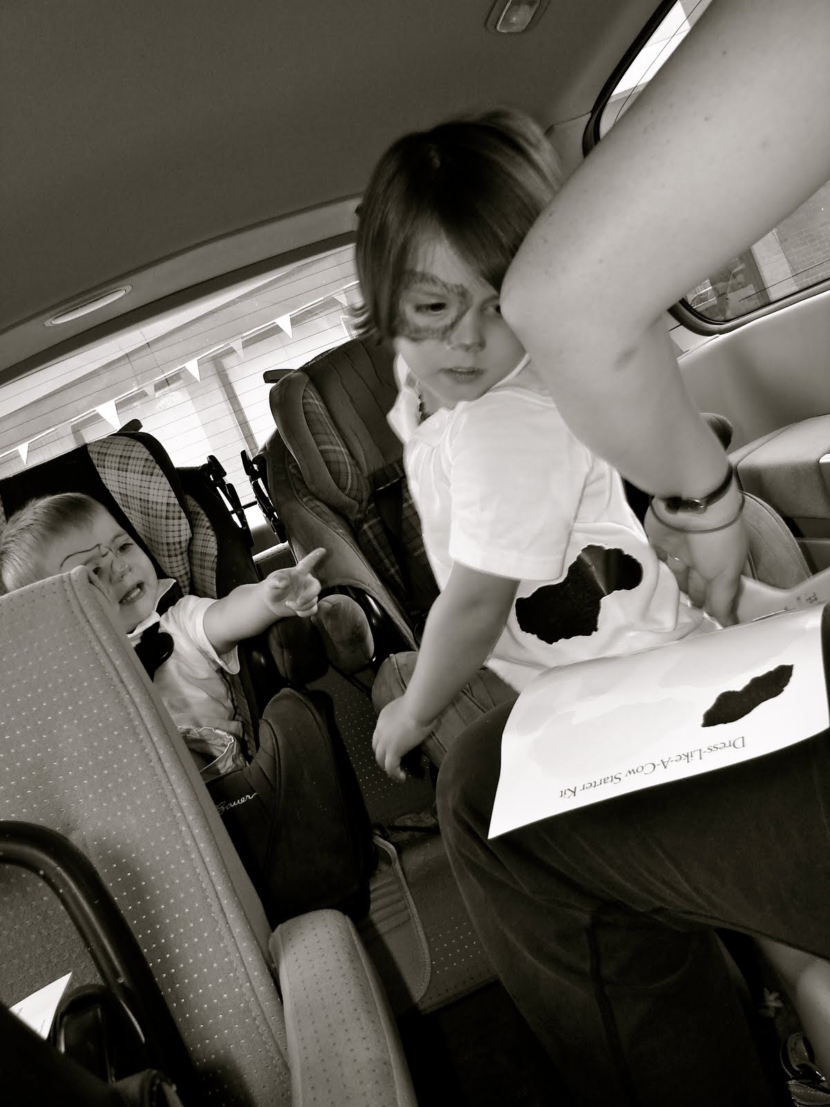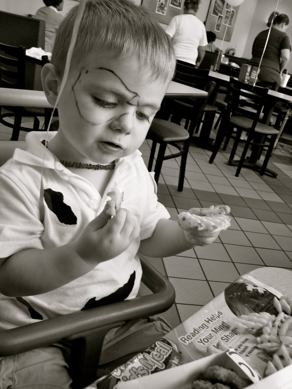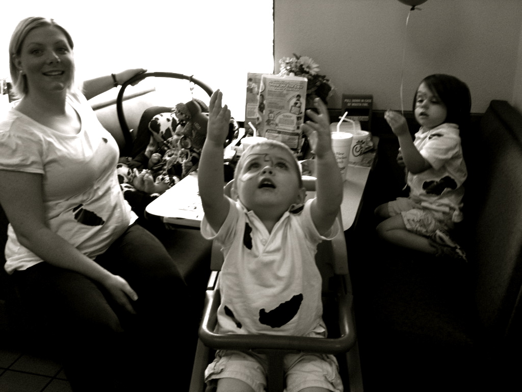 Right before we went into Chick-fil-a I put on the boys cow attire!