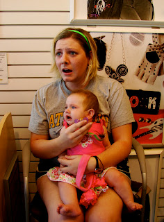 Okay, we were done, right? Then I heard…click, click…the lady was loading the gun. Oh snap! We haven’t even started yet. AND she was going to have to pierce each ear separately. Ugh! Not what I had hoped for.