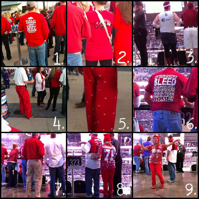 8. & 9. Not only did each piece of this lady’s attire have a different red, BUT she was crazy drunk even before the game started!!! (per picture 9) Hog hat, sequin top, tight red jeans, and sequin Ugg boots. TACKY!