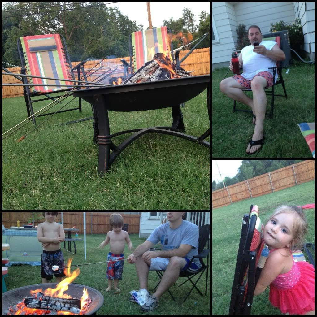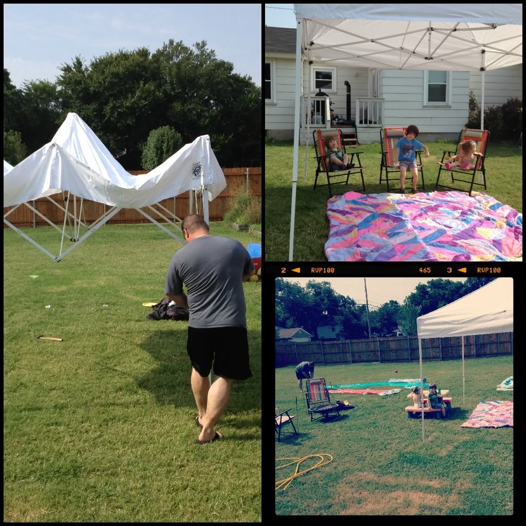My dad set up a tent, pool, two water slides, and a fire pit/sitting area!