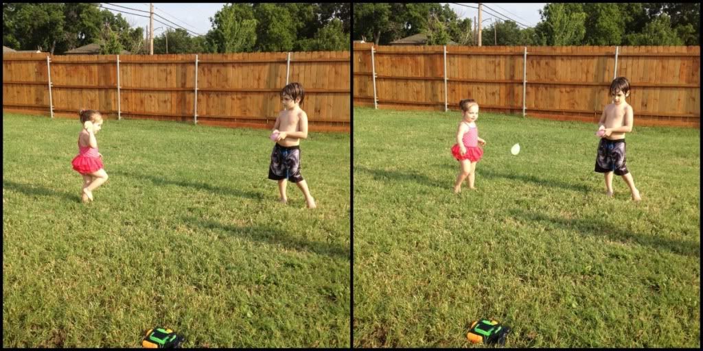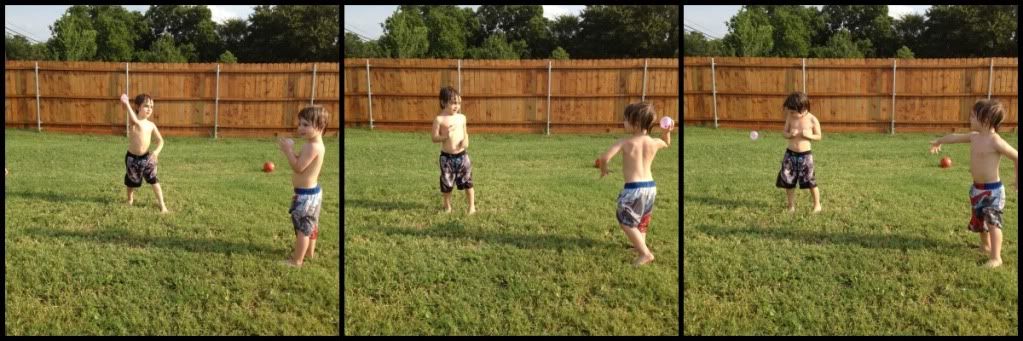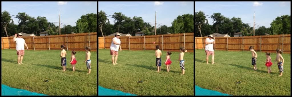 Gpops gave himself and each kid one water balloon then lined them up and told them to toss them “at Gpops”. But as you can see they only hit each other! Ethan’s balloon on the other hand went right to Gpops and burst on his chest!
