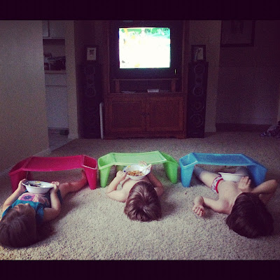 This is how the kids prefer to eat their breakfast in the mornings! Thankfully we don’t allow milk in the bowls if the eat in the living room. What a mess that would be. Not speaking from personal experience, nope…not at all. 😉