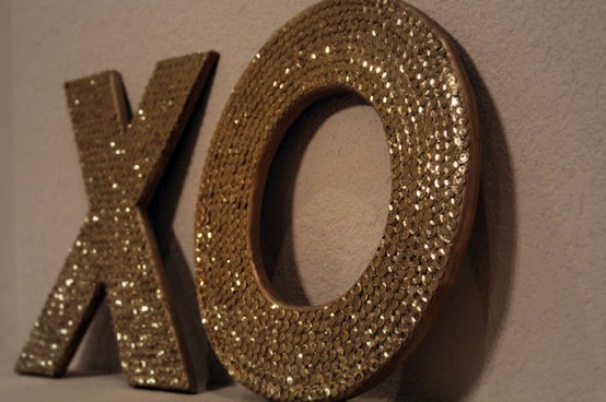 Grab cardboard letters at your local craft store (you can spell out LOVE or just do the XOXO). Then thinly coat them with mod podge or glue and sprinkle on glitter or cover in sequins! GORGE!