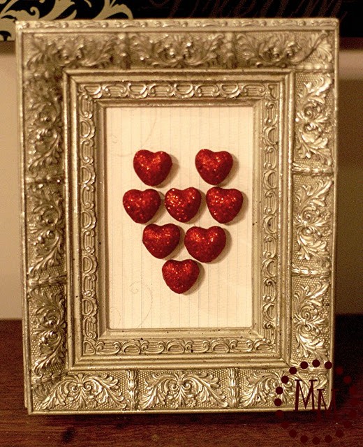 Glue 3D hearts or any other iconic V-Day items to a scrapbook paper and place in a frame for a quick touch of Valentine’s Day! (remember to remove the glass from the frame!)