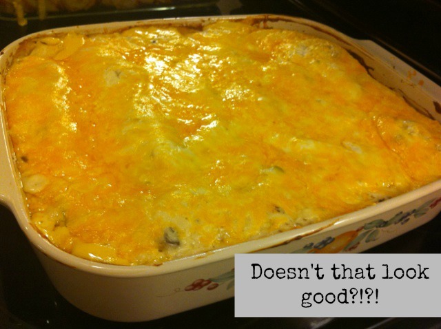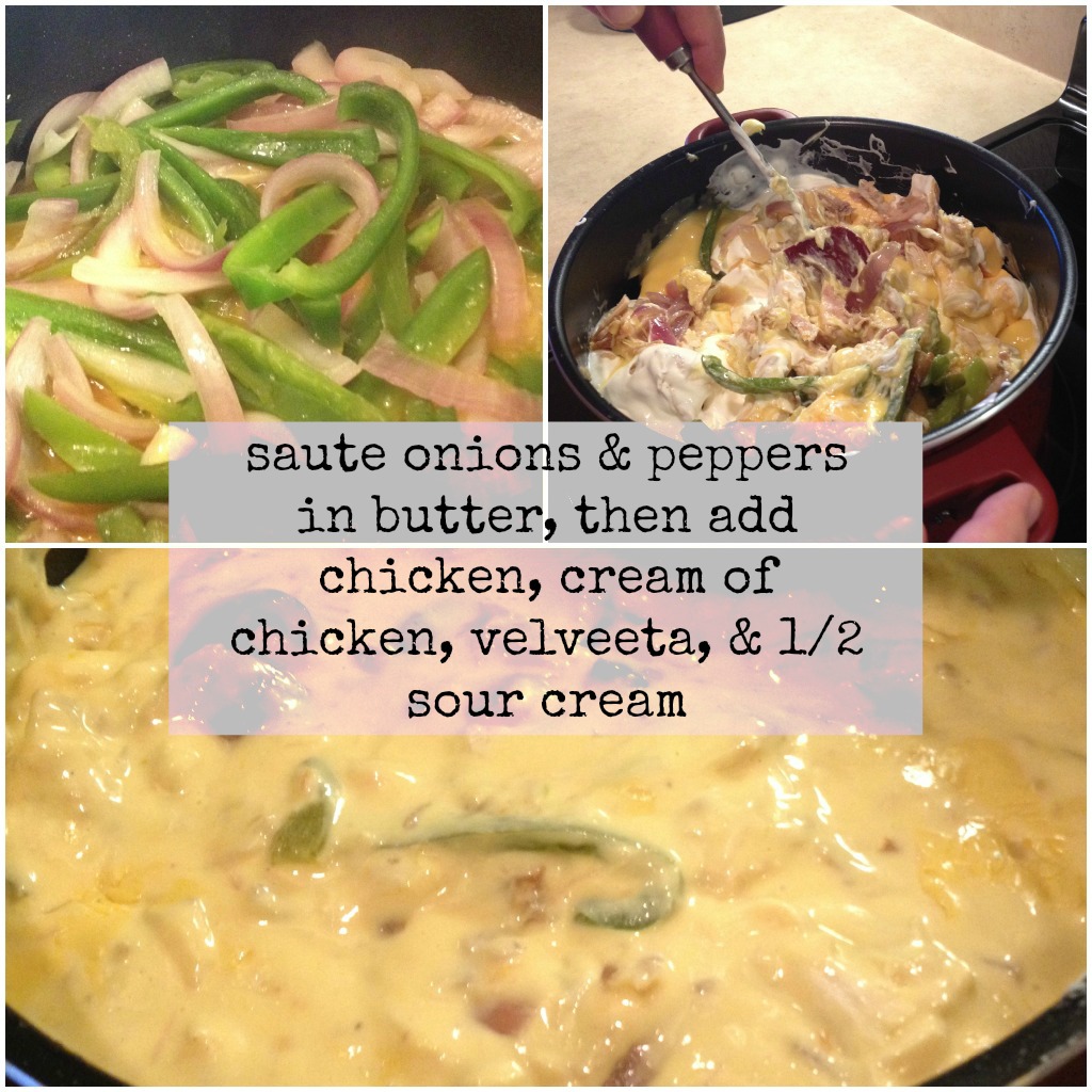 Then add in chicken, cream of chicken, velveeta, and 1/2 of your sour cream.