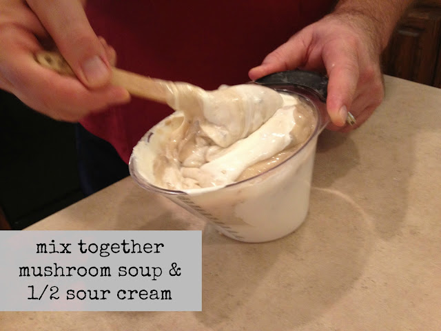 Mix the other 1/2 of the sour cream with the can of cream of mushroom together.