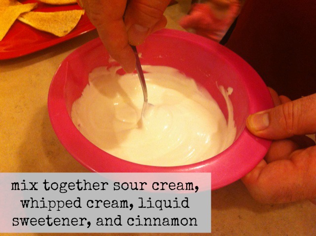 Now mix together in a medium bowl; sour cream, whipped cream, liquid sweetener, cinnamon, and sugar.
