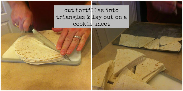 Cut tortillas into triangles and lay them out on a cookie sheet.