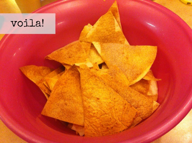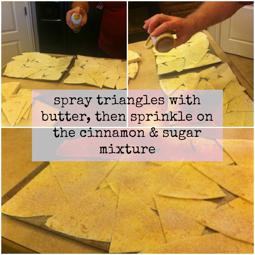 Lightly spray tortilla triangles with the butter spray and then sprinkle a coating of the pre-mixed cinnamon and sugar on top.