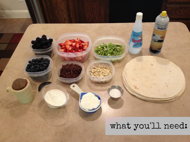 Hope you all enjoyed the first ever Cookin’ With Gpops a few months weeks ago. Last weekend I spent a little time with the old man and we (really he) whipped up some fun recipes for the blog. Boy were they GOOD and I can’t wait to share them with you over the next weeks! First off we have Guiltless Dessert Nachos. Most of us may be trying to shape up for the New Year, but still want a way to indulge a little without feeling bad for it. Or is that just me?? Thus, I bring you this AMAZING dessert.