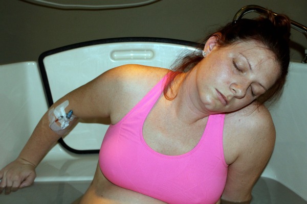 After that monitoring was finished I told my mom I thought I’d labor a bit walking and then head to the tub. I didn’t want to rush the tub for fear of it slowing my contractions down. We had come too far for that nonsense, ha! But once I stood up I immediately went to the birthing ball where I only lasted for about 2 contractions and then asked for the tub. The nurse asked if I wanted to be checked before heading into the tub and I agreed. Though it was only a two step trek from the ball to the bed, it seemed like a marathon, and as I paused for a contraction, I felt the baby’s head drop. I knew it couldn’t be long and in fact I was now 8 cm dilated. To the tub we went.
