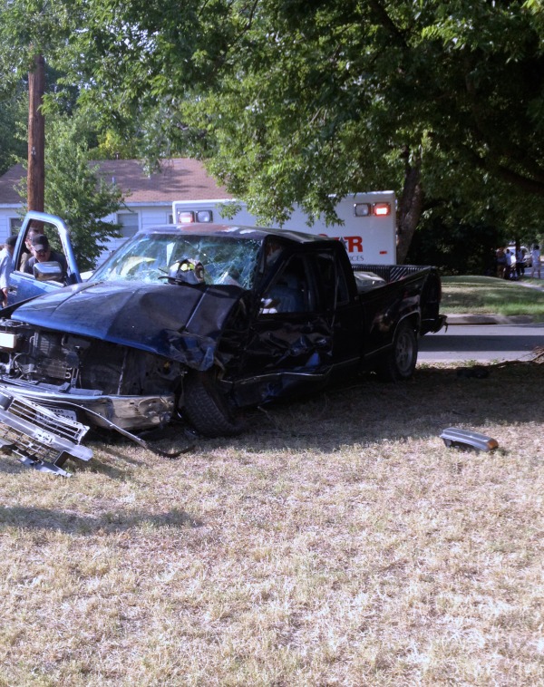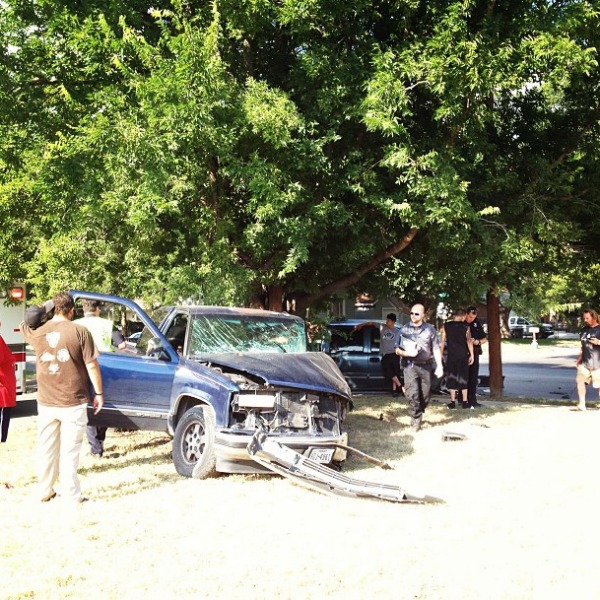 As the flood of cops, ambulance, and fire trucks came I ran back inside to make sure the kids were okay and told them to not look out the window. The whole ordeal took about two hours. There were 4 people involved in the wreck; two left without any medical needs, one was carted away on a stretcher for immediate help, and the last was arrested for driving under the influence. Our tree and lawn bare scars of the day’s events, and we are now “that” house that had the truck in their yard. But at least it wasn’t one up on blocks just for the fun of it, holla!